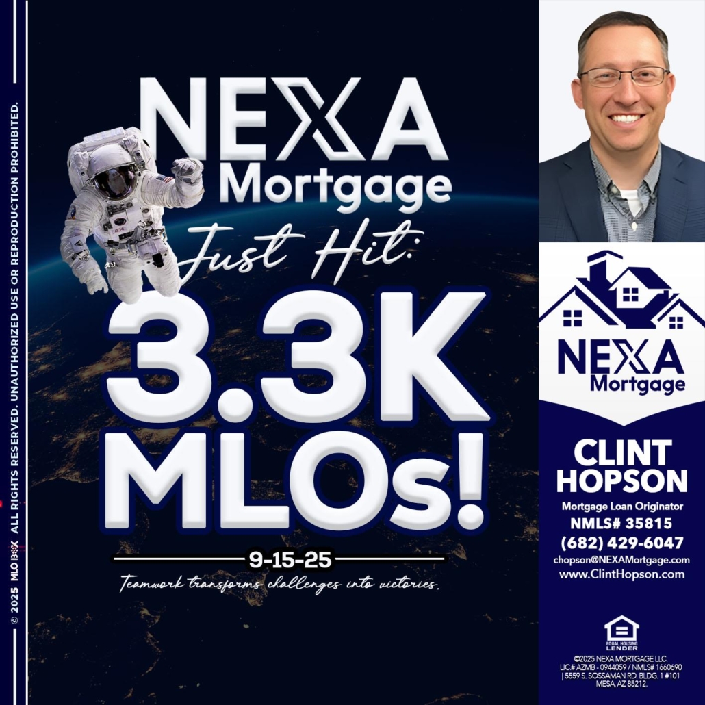 3.3K - Clint Hopson -Mortgage Loan OriginatorHi, my name is Clint Hopson. I’m a Loan Officer with NEXA Mortgage LLC., offering personalized mortgage solutions, fast customized quotes, great rates and service with integrity.