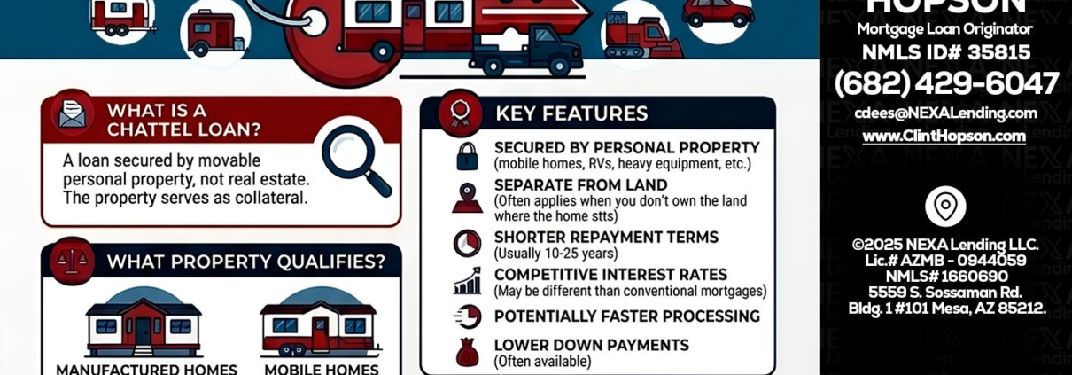 Hi, my name is Clint Hopson. I’m a Loan Officer offering personalized mortgage solutions, fast customized quotes, great rates and service with integrity. If you’re interested in learning more about the Chattel loan or any other, just let me know and I’ll walk you through your options.