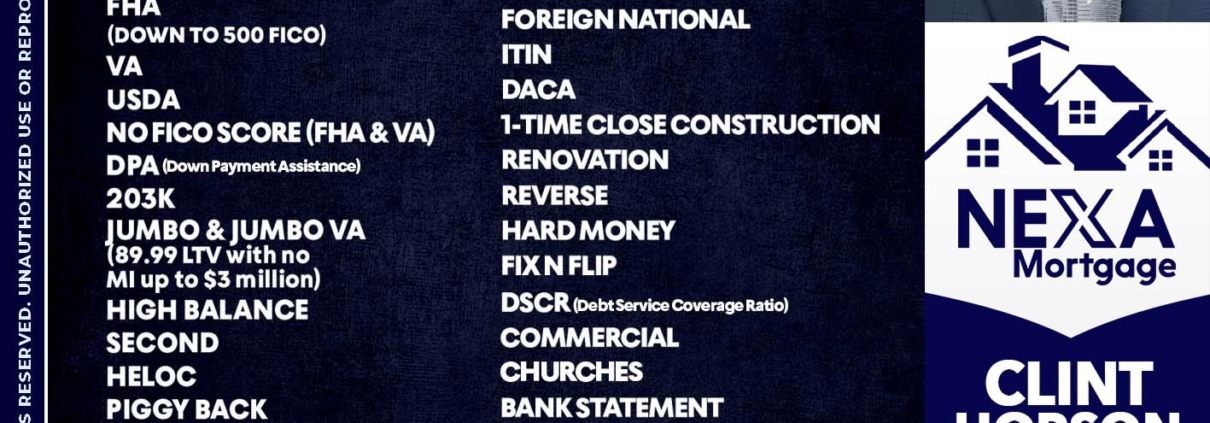 Hi, my name is Clint Hopson. I’m a Loan Officer with NEXA Mortgage LLC., offering personalized mortgage solutions, fast customized quotes, great rates and service with integrity.