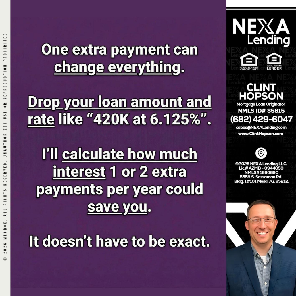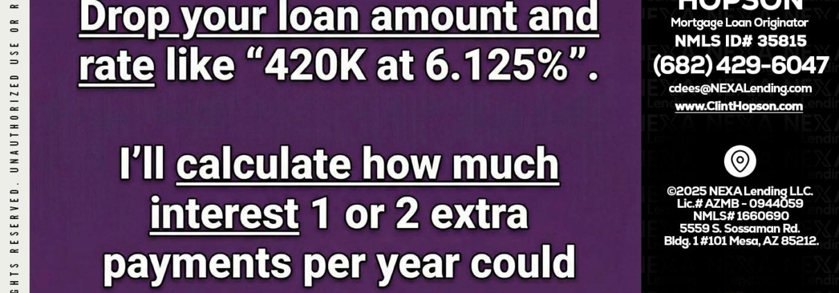 ONE EXTRA - Clint Hopson -Mortgage Loan OriginatorHi, my name is Clint Hopson. I’m a Loan Officer with NEXA Lending LLC., offering personalized mortgage solutions, fast customized quotes, great rates and service with integrity.