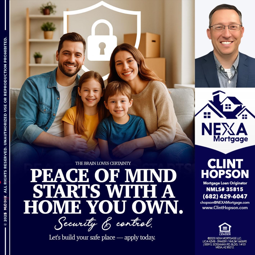 peace of mind - Clint Hopson -Mortgage Loan OriginatorHi, my name is Clint Hopson. I’m a Loan Officer with NEXA Mortgage LLC., offering personalized mortgage solutions, fast customized quotes, great rates and service with integrity.