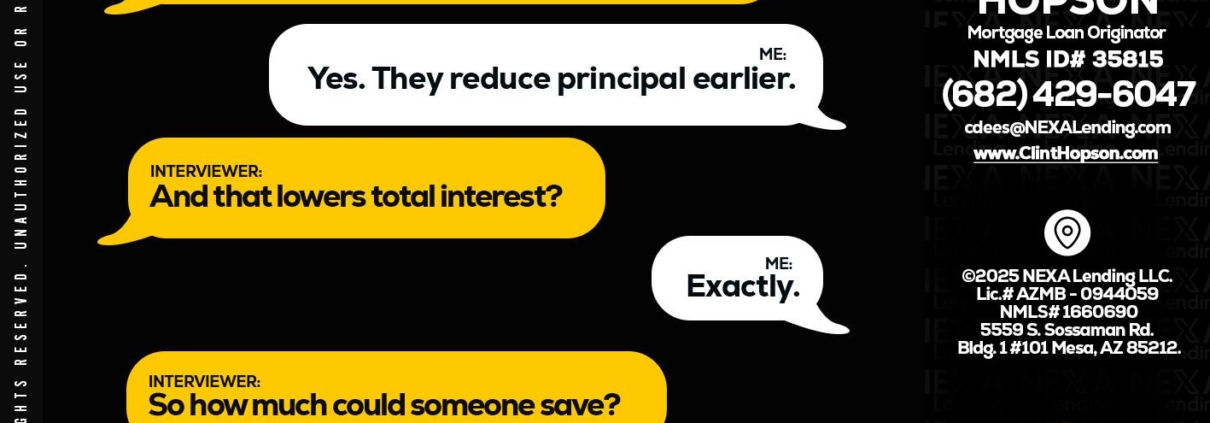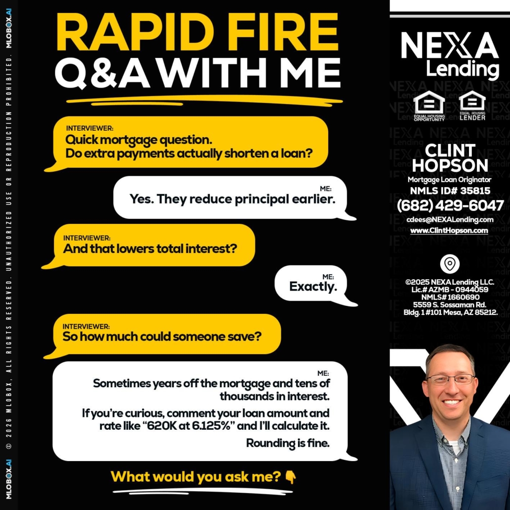 RAPID FIRE QA - Clint Hopson -Mortgage Loan OriginatorHi, my name is Clint Hopson. I’m a Loan Officer with NEXA Lending LLC., offering personalized mortgage solutions, fast customized quotes, great rates and service with integrity.