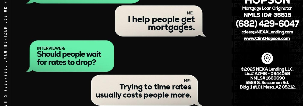 rapid fire - Clint Hopson -Mortgage Loan OriginatorHi, my name is Clint Hopson. I’m a Loan Officer with NEXA Lending LLC., offering personalized mortgage solutions, fast customized quotes, great rates and service with integrity.